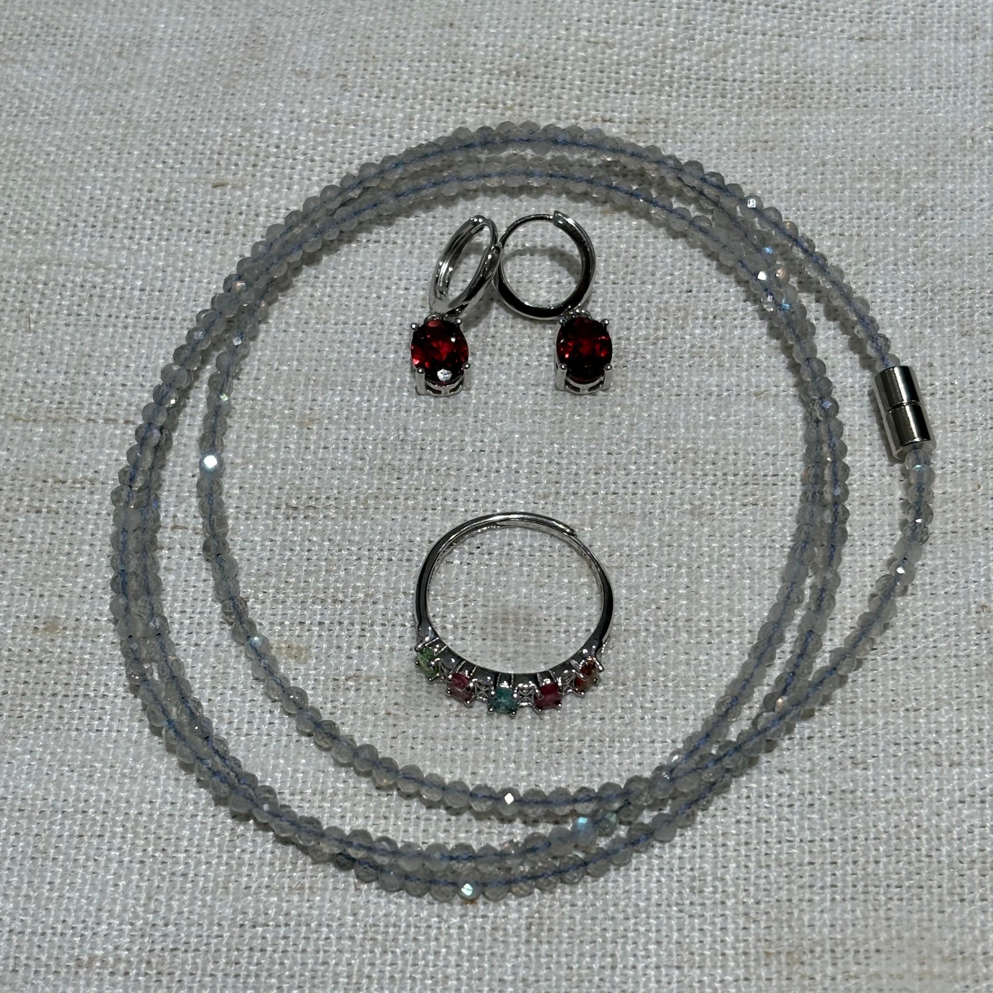 Custom-made S925 sterling silver natural rainbow tourmaline ring and garnet earrings