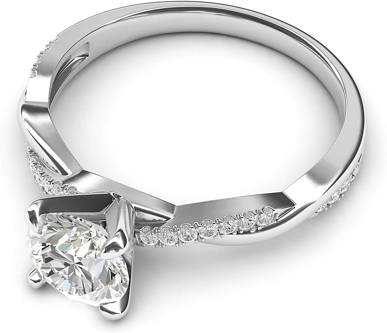Made of real Sterling Silver. Features 1 carat (6.5mm diameter, or 0.25inches) round brilliant cut clear simulated diamond in classic 4-prong setting. Accented with totally 22 round cut clear simulated diamonds in pave setting in the twisted band. Band measures 2.5mm in width.